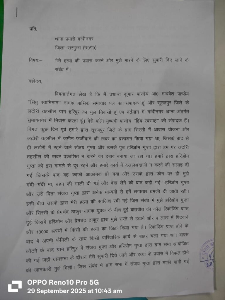 🔴आईजी सरगुजा रेंज को सुरक्षा हेतु आवेदन, थाना में सबूतों के साथ शिकायत दर्ज।