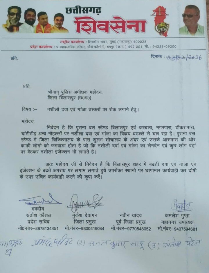 बिलासपुर। आज दिनांक 03 फरवरी 2026 को शिवसेना की बिलासपुर जिला इकाई द्वारा प्रदेश प्रमुख धनंजय सिंह परिहार के आदेशानुसार संतोष कौशल (प्रदेश सचिव) एवं मुकेश देवांगन (जिला प्रमुख) के संयुक्त नेतृत्व में माननीय जिलाधीश तथा माननीय पुलिस अधीक्षक महोदय को आमजन की समस्याओं के निराकरण हेतु ज्ञापन सौंपा गया।