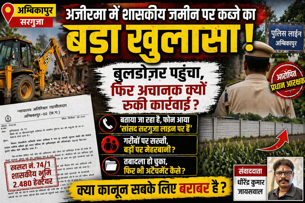 सरगुजा जिले के अम्बिकापुर विकासखंड अंतर्गत ग्राम अजीरमा में शासकीय भूमि पर कथित अतिक्रमण का मामला अब तूल पकड़ता जा रहा है। प्रशासनिक कार्रवाई के बीच अचानक बुलडोज़र रुकने और कथित राजनीतिक हस्तक्षेप के आरोपों ने पूरे घटनाक्रम को विवादास्पद बना दिया है।