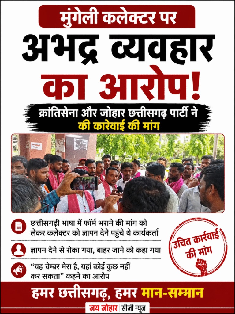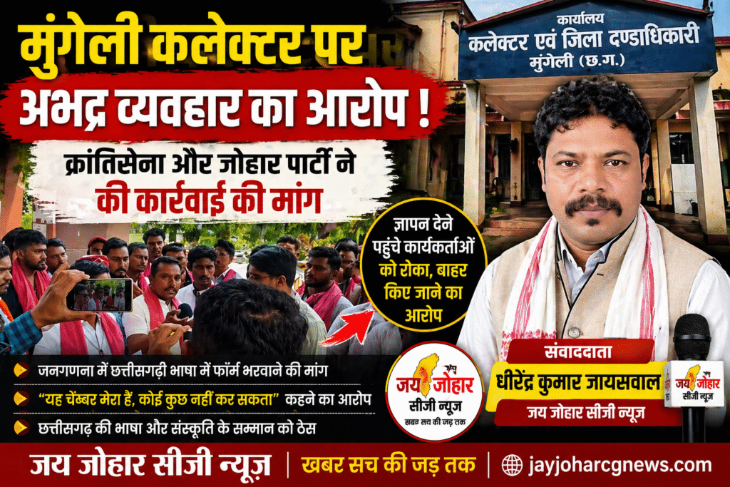 मुंगेली जिले के कलेक्टर पर अभद्र व्यवहार का गंभीर आरोप सामने आया है। यह आरोप छत्तीसगढ़ क्रांतिसेना और जोहार छत्तीसगढ़ पार्टी के पदाधिकारियों द्वारा लगाया गया है।