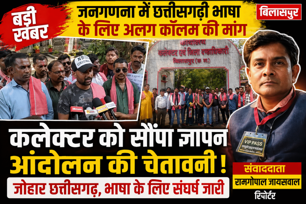 छत्तीसगढ़िया समाज एवं छत्तीसगढ़िया क्रांति सेना, बिलासपुर के नेतृत्व में जनगणना में छत्तीसगढ़ी भाषा को पृथक पहचान दिलाने की मांग को लेकर जिला कलेक्टर को ज्ञापन सौंपा गया। इस दौरान बड़ी संख्या में समाज के लोग मौजूद रहे और भाषा, संस्कृति एवं अधिकारों की रक्षा को लेकर जोरदार आवाज उठाई गई।