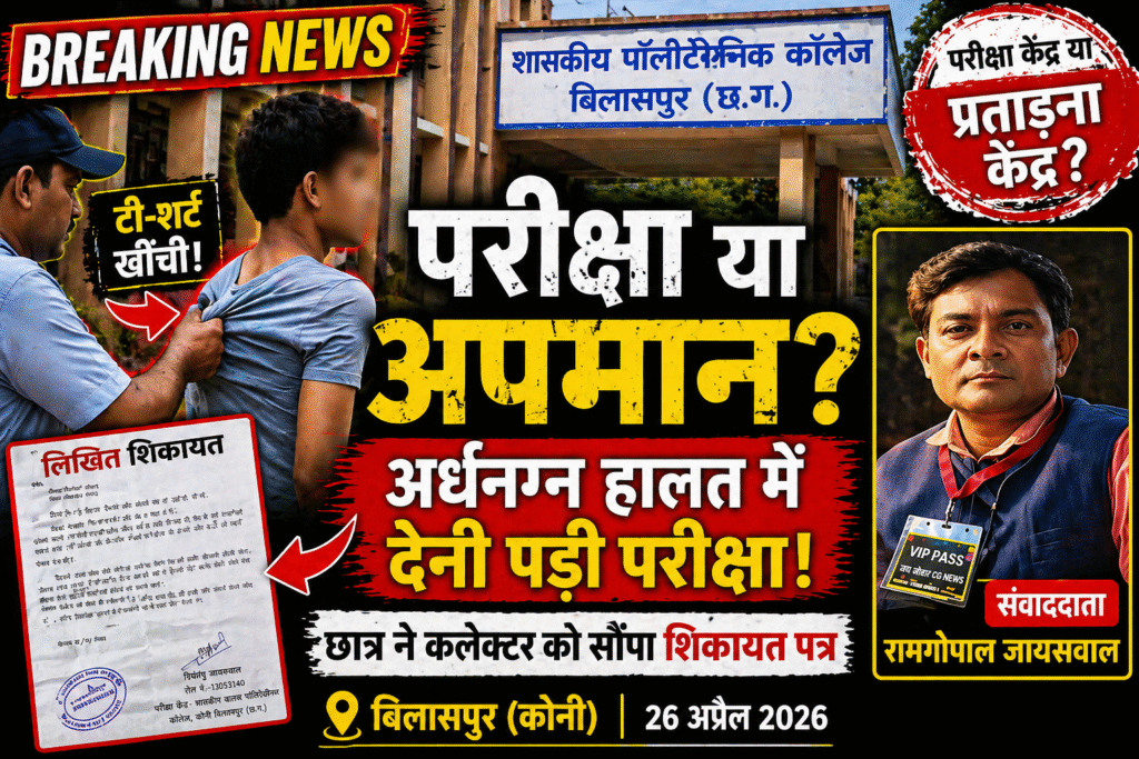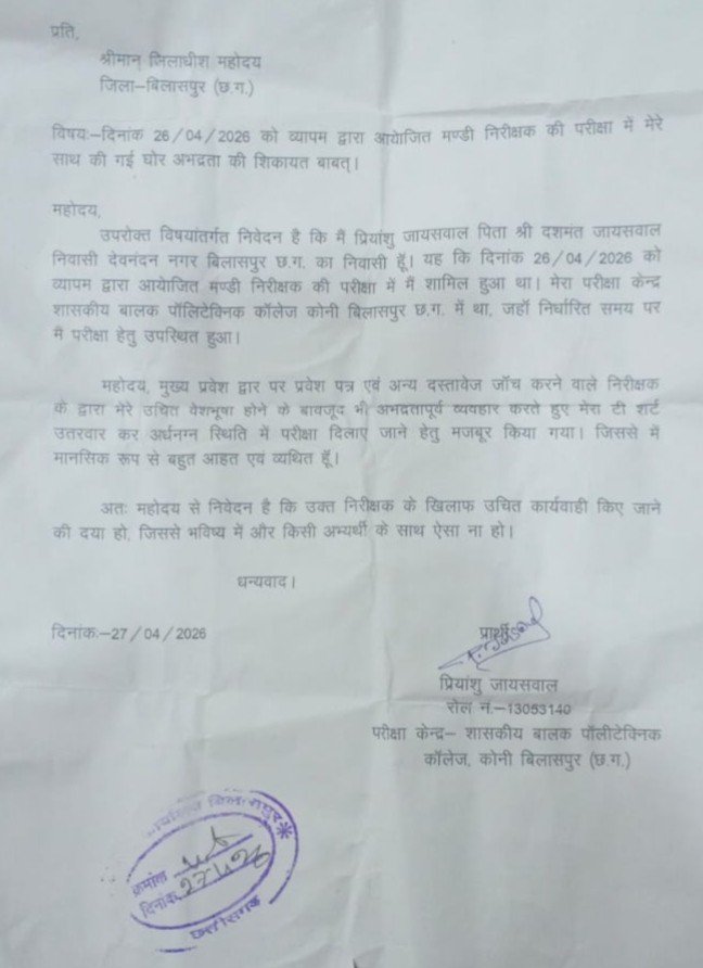 छत्तीसगढ़ में प्रतियोगी परीक्षाओं की पारदर्शिता पर एक बार फिर सवाल खड़े हो गए हैं। बिलासपुर के कोनी स्थित शासकीय बालक पॉलिटेक्निक कॉलेज में आयोजित व्यापम की मंडी निरीक्षक परीक्षा के दौरान एक परीक्षार्थी के साथ कथित अमानवीय व्यवहार का मामला सामने आया है।